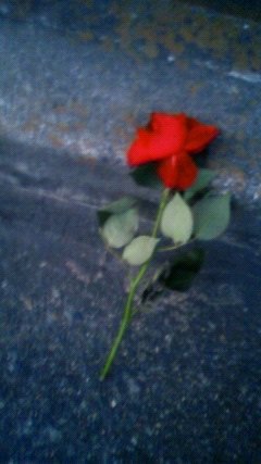 道路脇に、バラ。一輪の、真っ赤な薔薇。