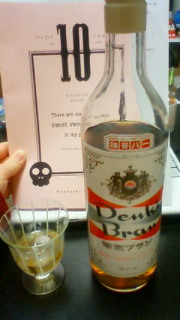浅草で買った電気ブラン。後ろに写ってるのは今回のパンフレット。まだ微かに甘い匂いがします。