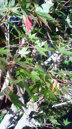 イチョウはもうまっ黄色の葉っぱパラパラ落としてるのに、モミジは今から色づく気ですか?